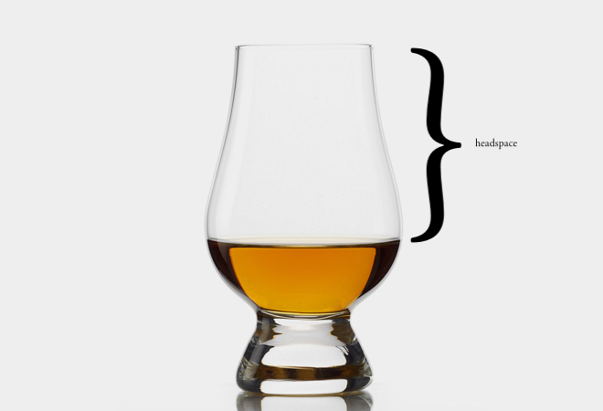 Ibland dyker termen headspace upp i teknisk whiskylitteratur. Vad är nu det då? Jo, den del av ditt whiskyglas som det inte finns whisky i; den del av din flaska som det inte finns whisky i; även luftfickan i fat där whisky lagras. Helt enkelt: luften ovanför spriten.